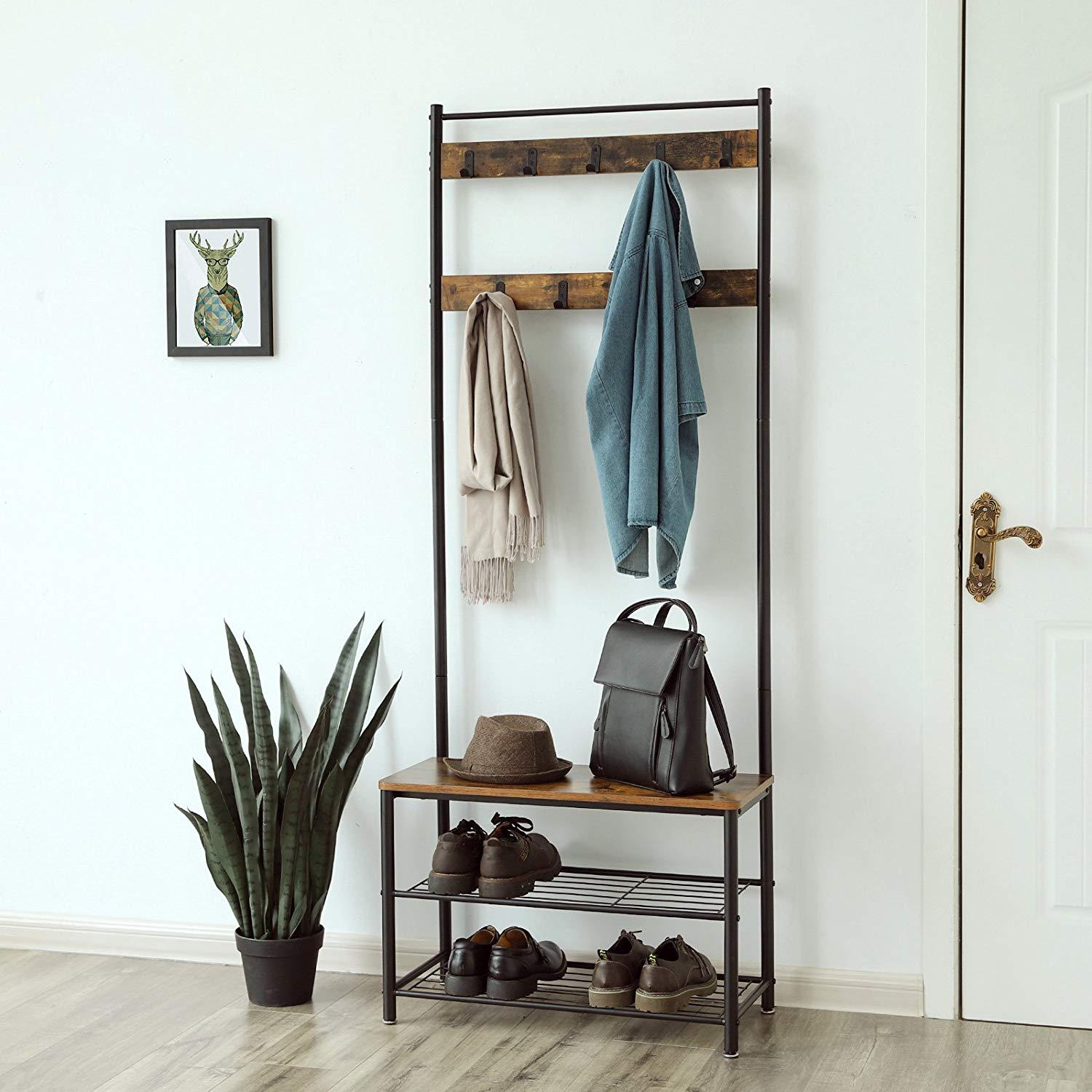 Pladsbesparende garderobestativ i rustikt look Få styr på dit overtøj, samtidigt med at du udover funktionaliteten, også får et møbel i lækkert og tidsløst design. Dette flotte garderobestativ i rustik stil er et vaskeægte multimøbel, der skaber orden såv