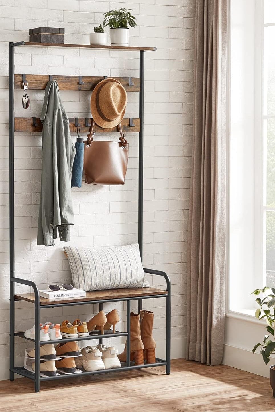 Garderobestativ / tøjstativ med bænk Dette garderobestativ med bænk er det perfekte valg for dig, der leder efter et stilfuldt og funktionelt møbel til dit hjem. Det har et industrielt look, der vil tilføje et strejf af personlighed til ethvert rum. Funk